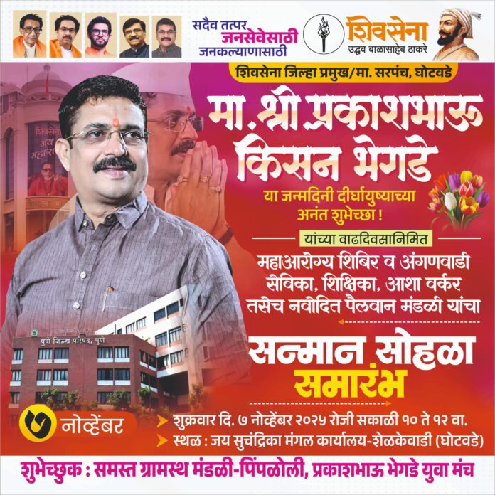 पुणे जिल्हा प्रमुख प्रकाश किसन भेगडे यांच्या वाढदिवसानिमित्ताने महाआरोग्य तपासणी शिबीर, अंगणवाडी सेविकाशिक्षिका, आशा वर्कर, तसेच नवोदित पैलवान मंडळींचा सन्मान सोहळा समारंभ शुक्रवार दिनांक ७ नोव्हेंबर रोजी शेळकेवाडी (घोटावडे) येथील जय सुचंद्रिका मंगल कार्यालयात आयोजित करण्यात आला आहे. या उपक्रमाचे तालुक्यात कौतुक होत आहे.